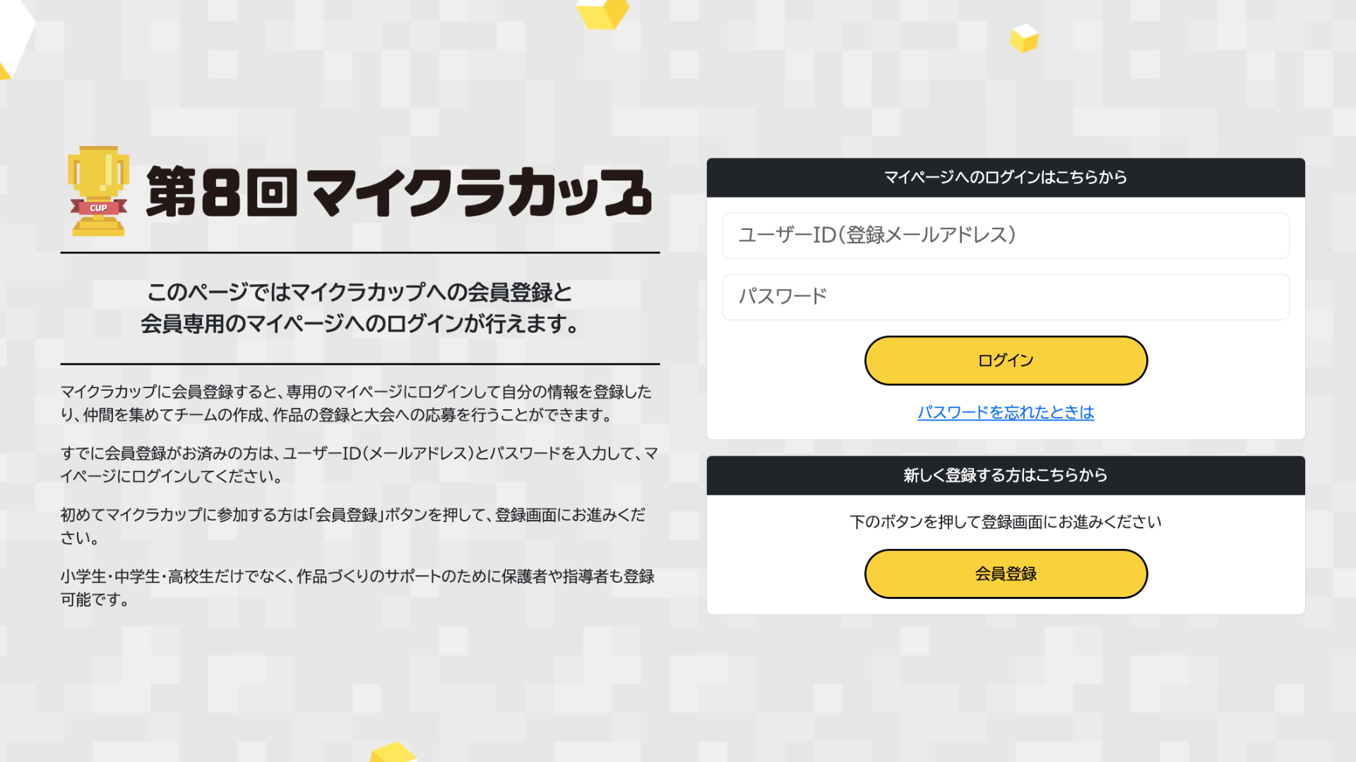まずは、大会公式サイトで無料の会員登録を行います。1人でもチームでも参加できます。会員登録をするとマイページがつくられ、過去作品のマイクラワールドがダウンロードできたり、作品の応募ができるようになります。