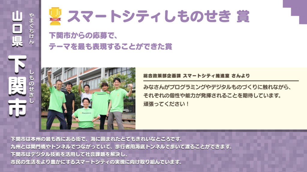 第7回Minecraftカップ自治体パートナー山口県下関市「スマートシティしものせき賞」表彰式の様子をご紹介します