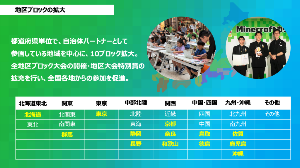 今後は、誰しもが挑戦できる機会として、Minecraftカップが魅力的な大会となり、参加する人や関わる人を増やしていくために、47都道府県すべてでの予選・地区大会の開催を目指していきます。
