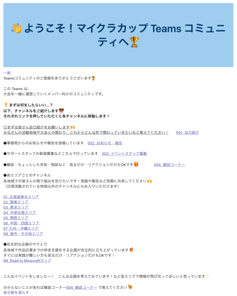 このTeamsコミュニティは、マイクラカップを一緒につくっていく運営・サポートに関わる方をはじめ、