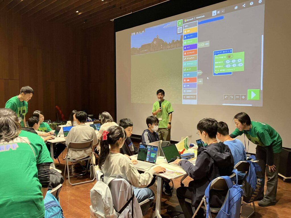 昨年度開催の、第6回Minecraftカップ全国大会で最優秀賞を受賞したチーム「弘前高校メディアクリエイト同好会」の作品に刺激を受けながら、自分たちの手でまちを“再構築する”体験を楽しむ姿が印象的でした。