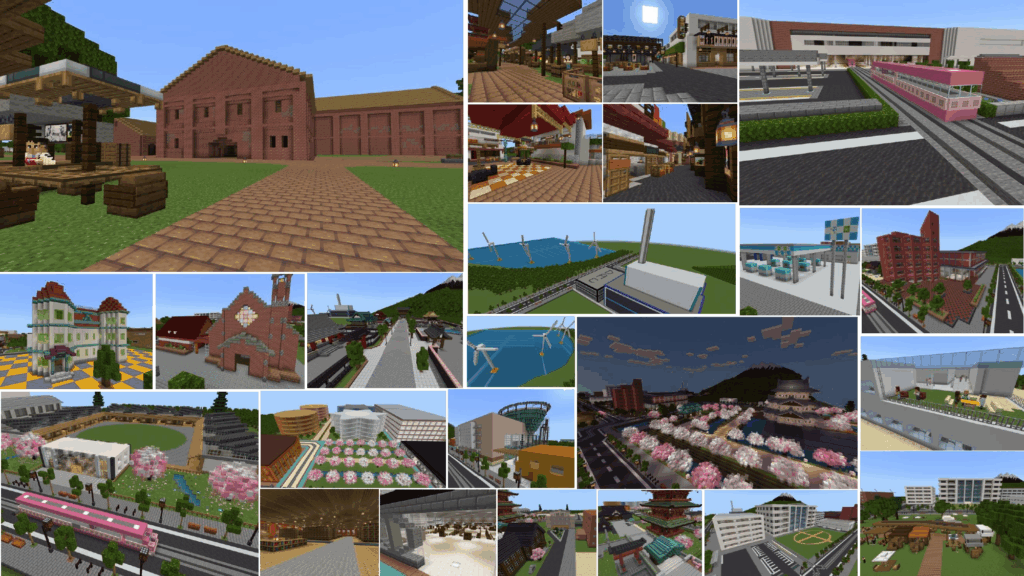過去のMinecraftカップで全国大会 最優秀賞を受賞した弘前高校メディアクリエイト同好会のワールドを教材に、子どもたちは「子どももお年寄りも交流できる」「未来の図書館」「未来の弘前駅」などをテーマに、未来のまちを再設計していきます。