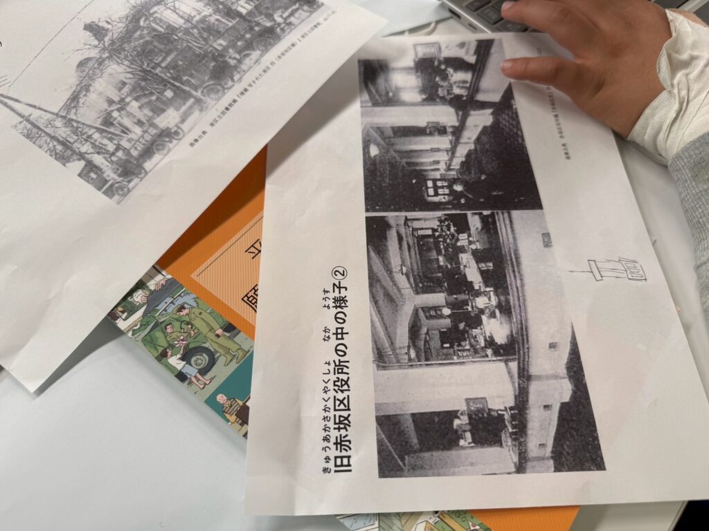 最初に、白黒写真やカラー化された当時の写真を見ながら、戦前・戦後の港区の様子や、人々の暮らしについて学びました。