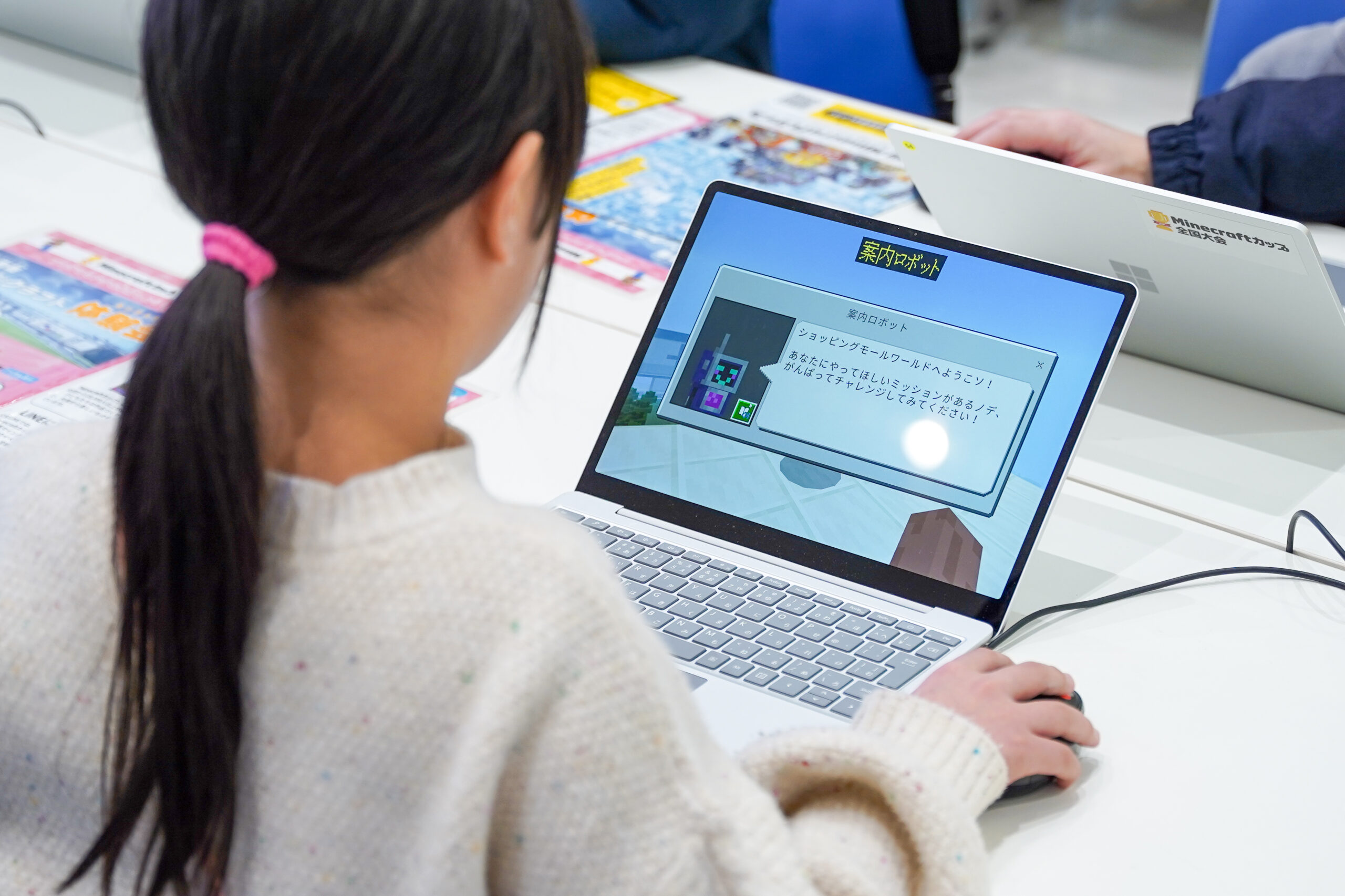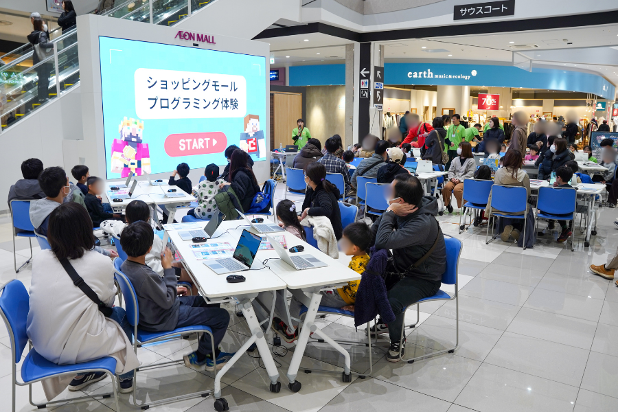 1月18日に、埼玉県にある「イオンモール上尾 1Fサウスコート」にて、大会オリジナル制作のイオンモールワールドを使った「教育版マインクラフト プログラミング体験会」を開催しました。