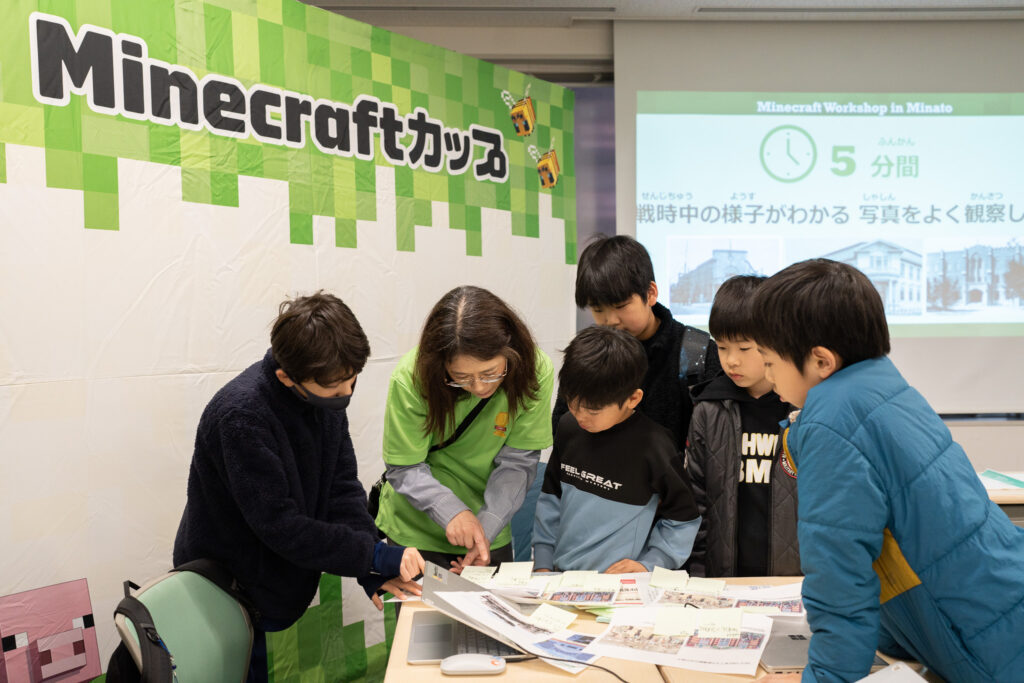 当日は、子どもたちがグループに分かれ、戦時中の港区の建物や暮らしについて学びながら、教育版マインクラフトの港区ワールド上で歴史的な建物や街並みの再現に取り組みました。