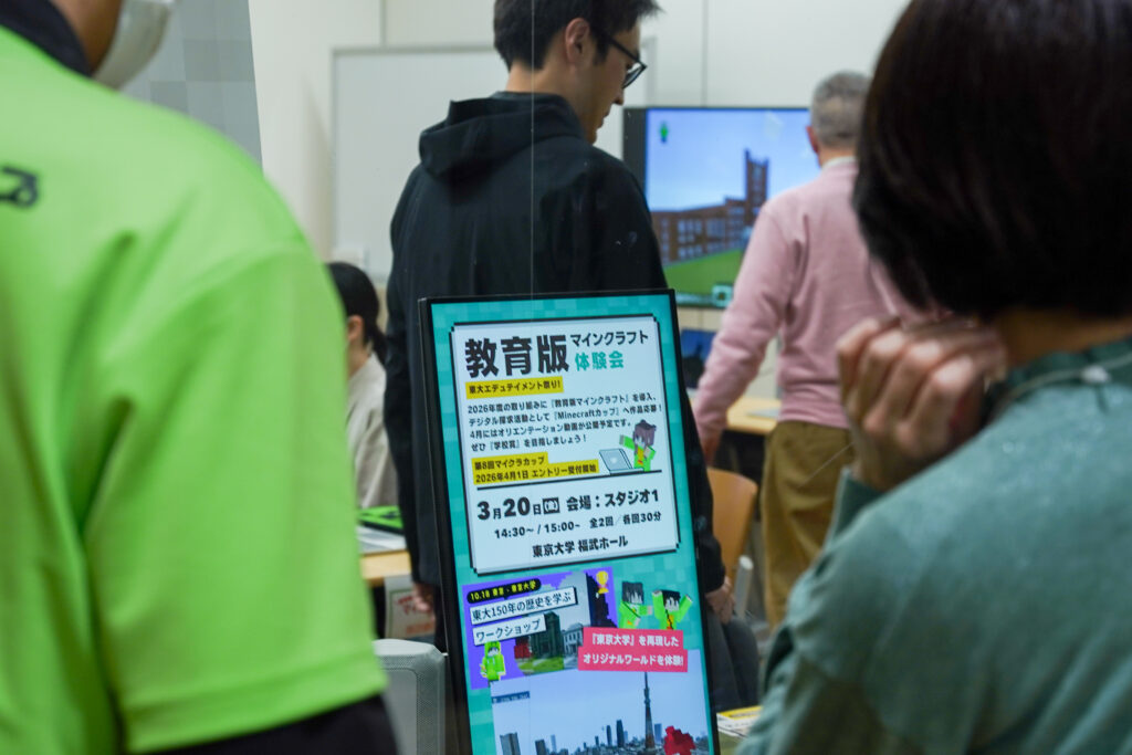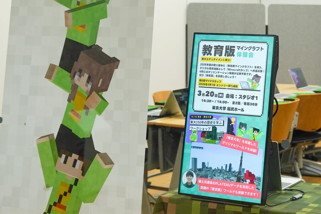 東京大学本郷キャンパス 情報学環・福武ホールで開催された「エデュテイメント祭り!」にて、教育版マインクラフトの体験会・講演を行いました