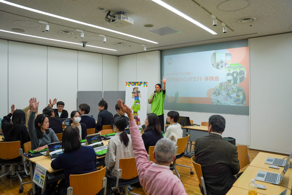 全国から集まった教員、教育委員会職員、教育系企業、学生などを対象に、PCを用いたオンラインマルチプレイ形式で教育版マインクラフトの体験を行いました。