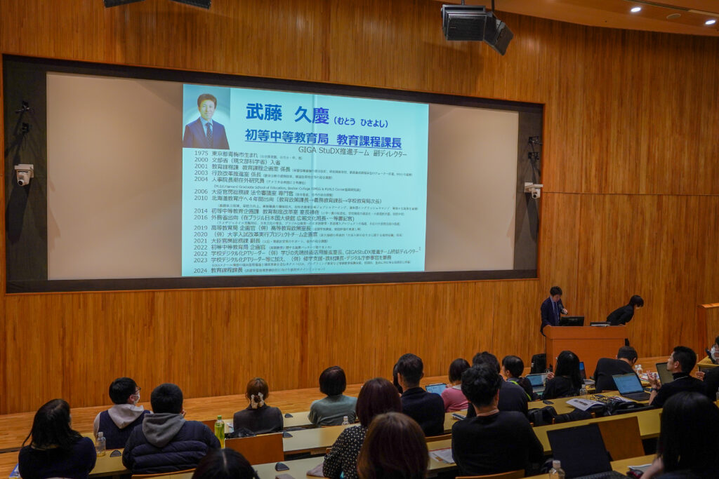 講演会では、これまで7回にわたって実施してきたマイクラカップの概要や、教育版マインクラフトを活用した取り組みを通じて得られてきた教育的な効果について紹介しました。