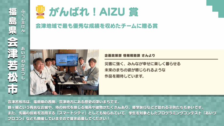 | 審査方法 | 各地区の会場で1 チーム毎に、以下の内容を発表する審査会方式。 ①1分間の作品紹介動画の再生 ②2分間のスピーチによるプレゼンテーション ③審査員からの質疑応答 |